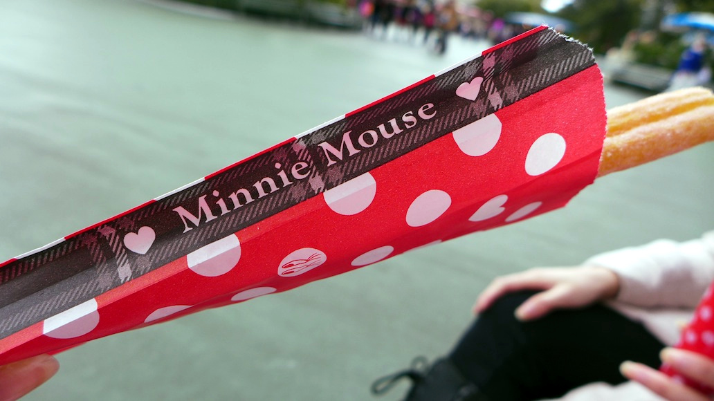 買了一直想買的有沾醬版吉拿棒,米妮的是草莓牛奶棒配巧克力醬
